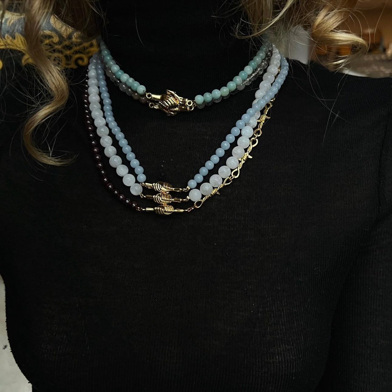 Beautiful magnetic hand clasp on this baddie barbed half chain and healing stones combo choker! Only 10 made of each so grab yours before they’re sold out!