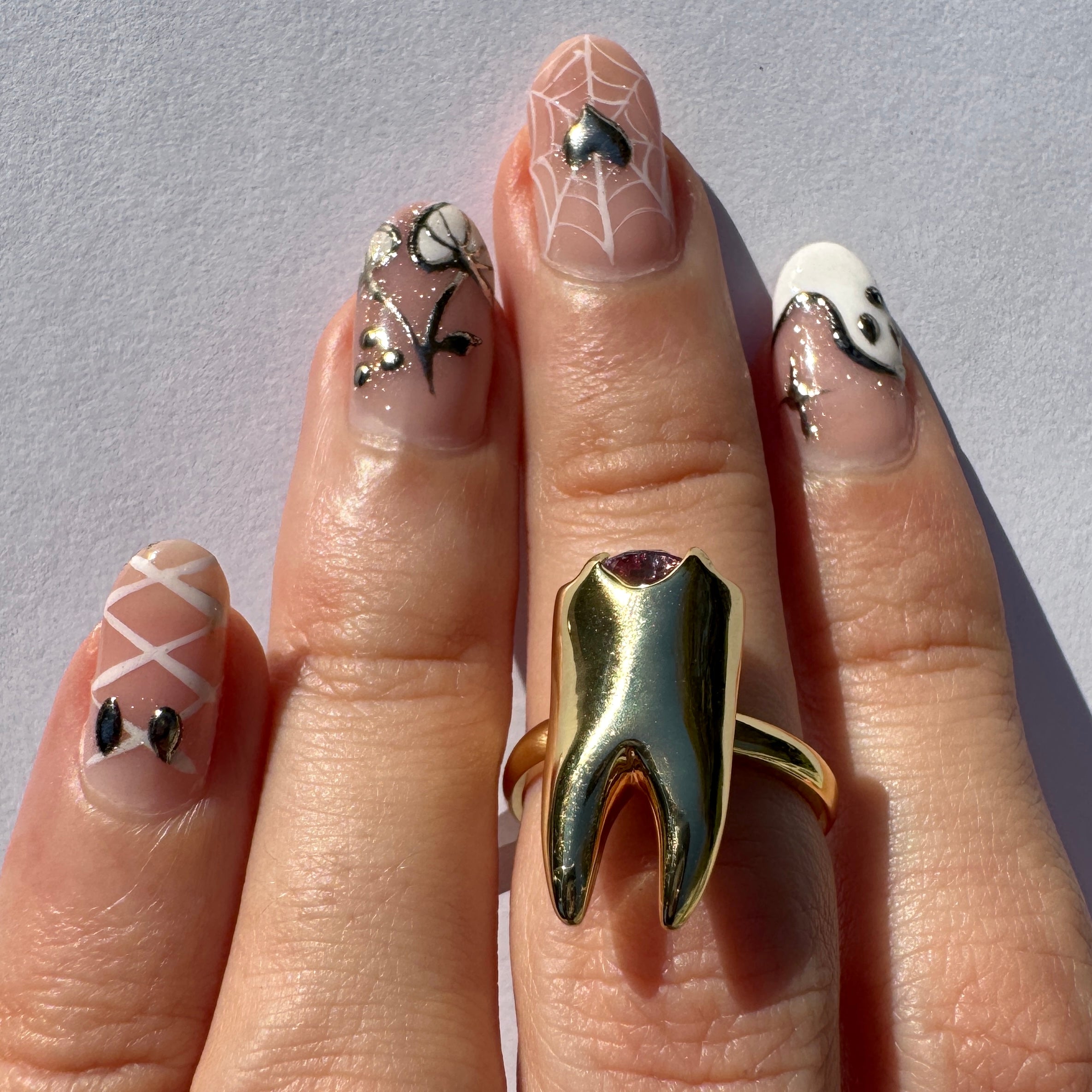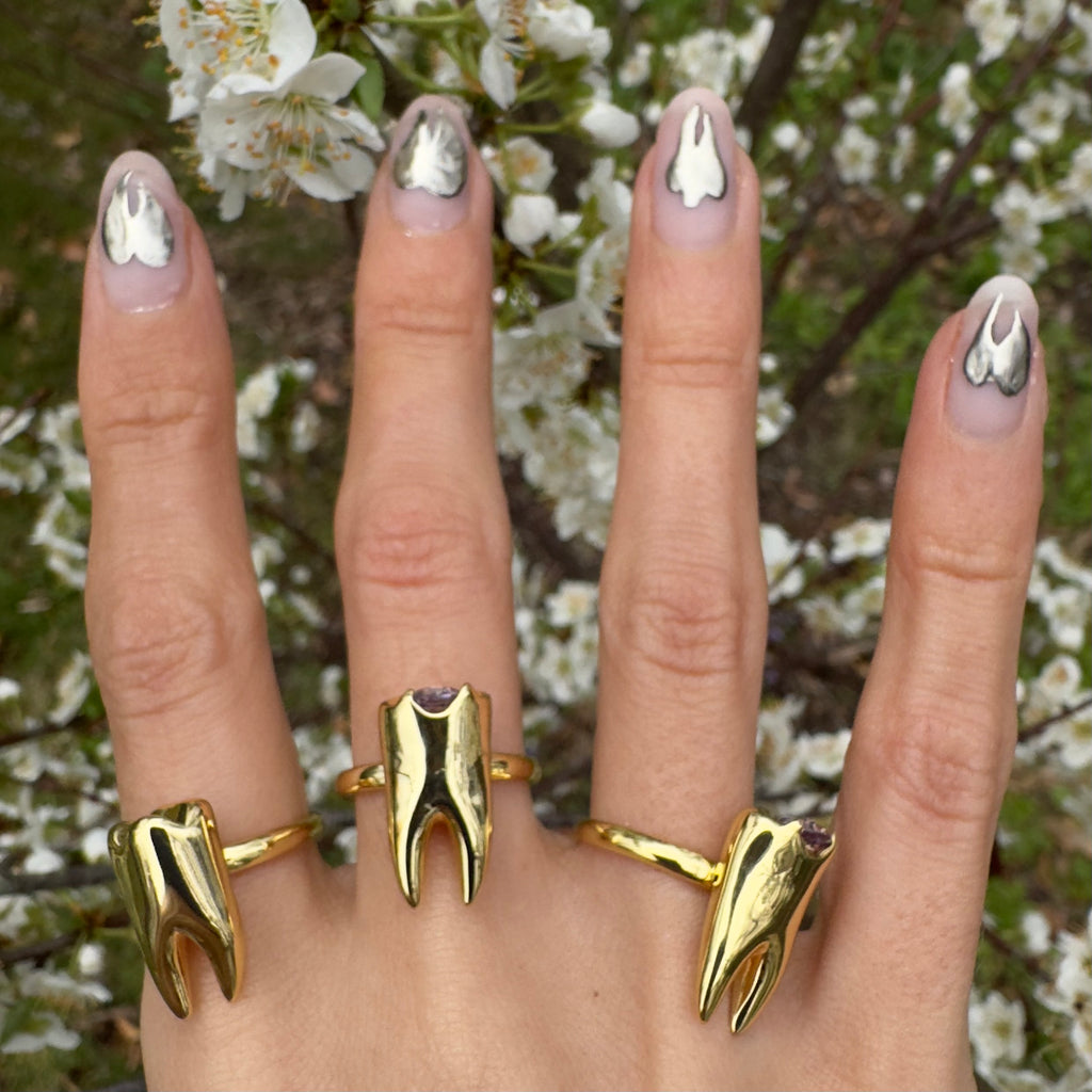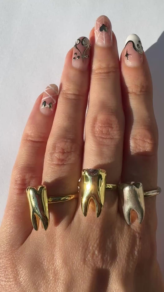 This beautiful wisdom tooth ring is a rad additional to any hand, fab by itself or layered with many other rings. Scroll to see layering idea! Gold brass with gold plate.