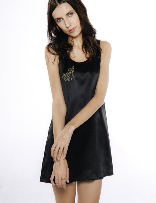 Want to be a pretty Kitty?A line dress! This 100% Silk little black dress will get you on your way with it's gold embroidery of a kitty licking herself. Good for everyday with it's A-line cut and yet you can go out at night in this no problem!