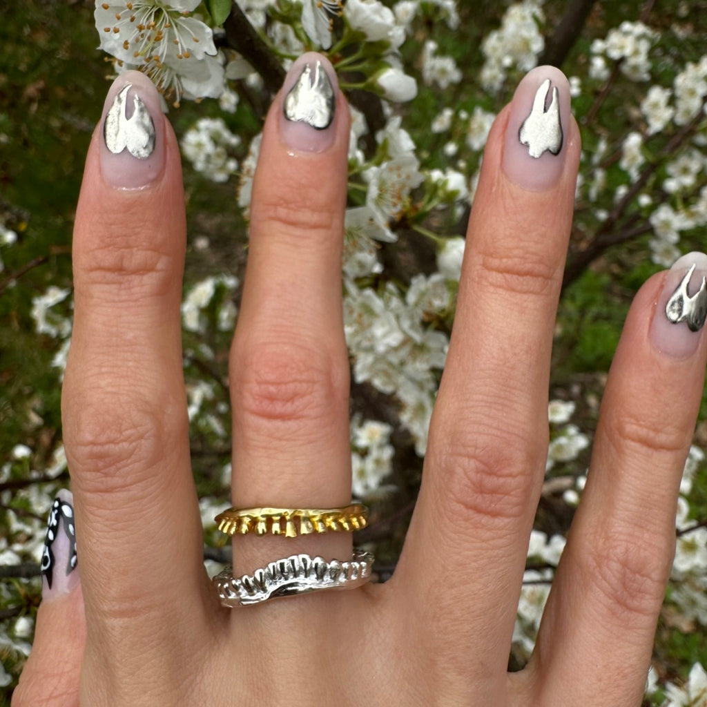 This jaw ring is wide open and ready to eat up your finger! One jaw comes per order, but they are really great for stacking and layering for a full set of teeth.
