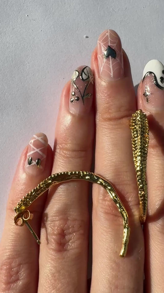 Classic hoops from far away, bad ass spine danglers close up! Posts are silver with gold on top for gold brass option and silver option it's all sterling silver yay.