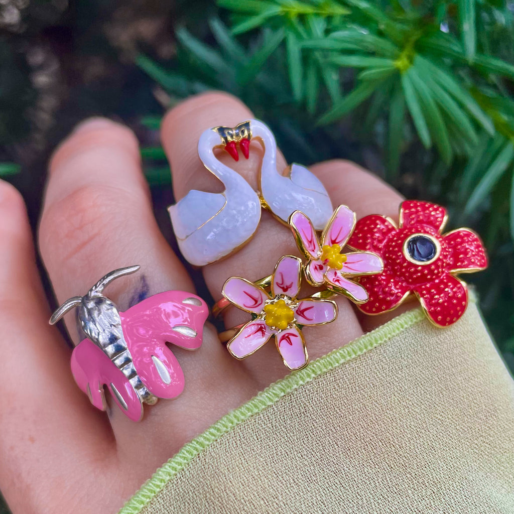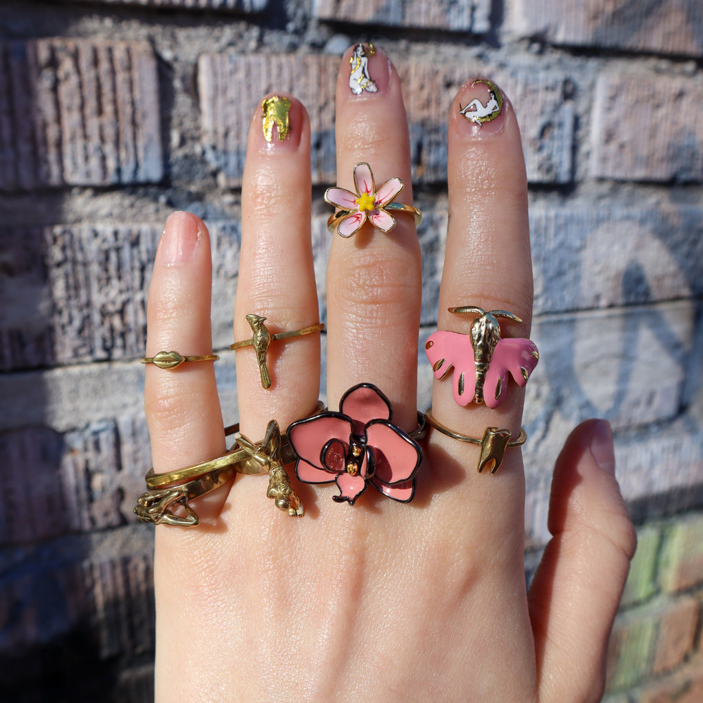This beautiful carnivorous flower ring is inspired by Drosophyllum, which is native to the Mediterranean region. Often mistakenly recognized as Sundew, a close relative, but this baby is much more badass! Nibbling up sunlight and bugs. Are you beautiful on the outside but pack a surprise on the inside?