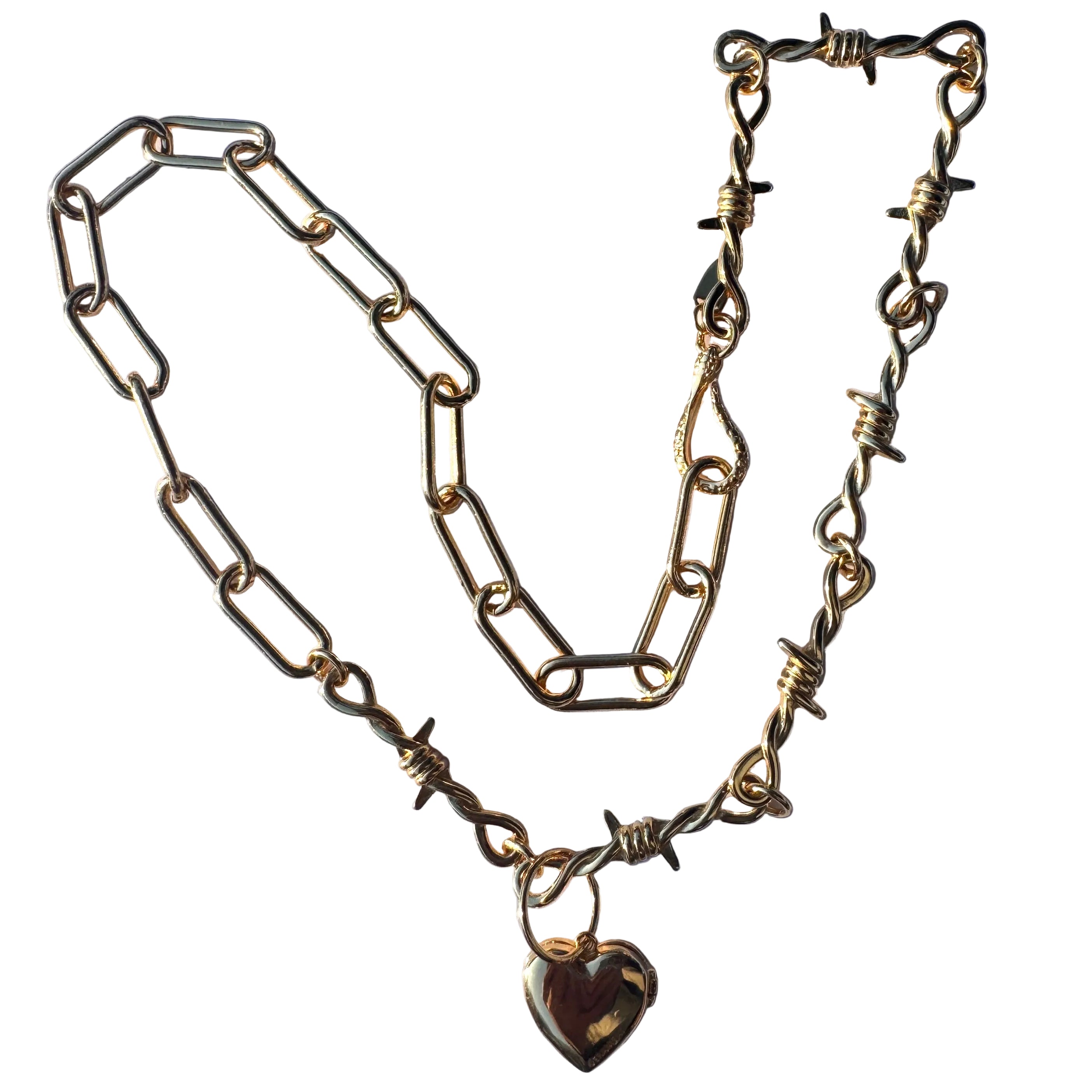 This heart locket is on a half barbed & half cool thick chain. Super badass yet sweet with a locket you can open and put a photo into! Material is alloy with gold plate or dark gun metal plate.