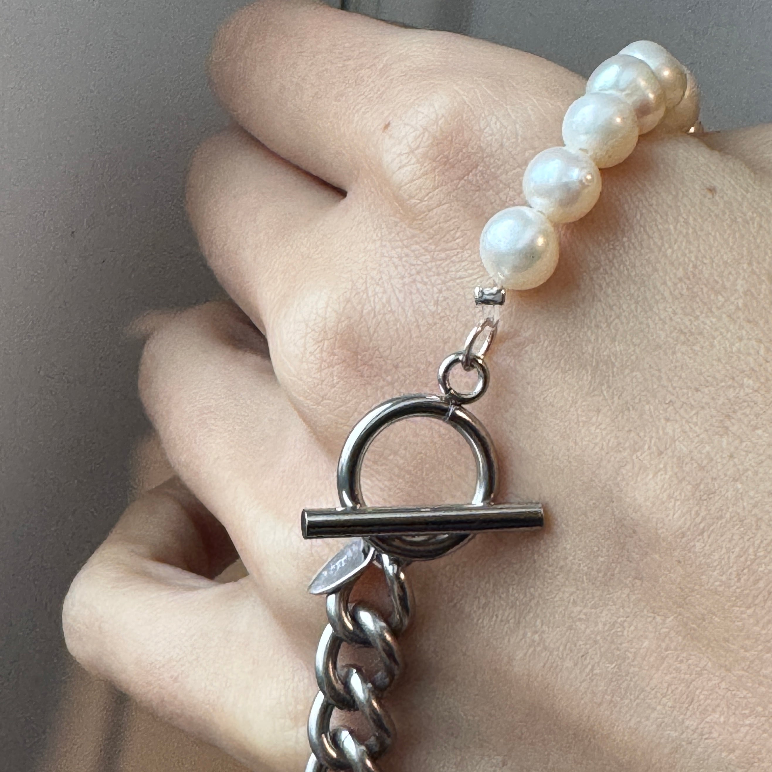 A NY elegant yet badass real pearl chain with half being a cool chain that’s brass with silver plating. Good for any occasion and makes a great V-day gift, even for yourself! It’s 16” but scroll down for 14” and 18” options!