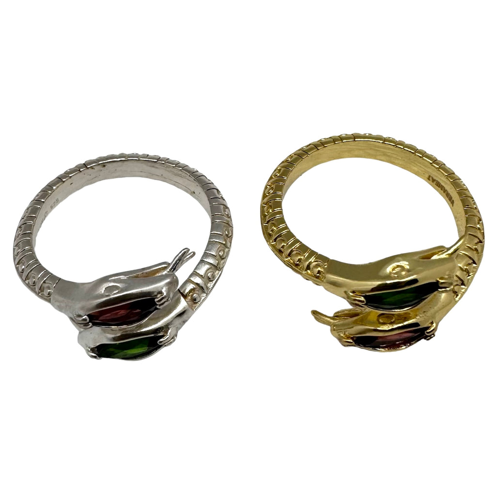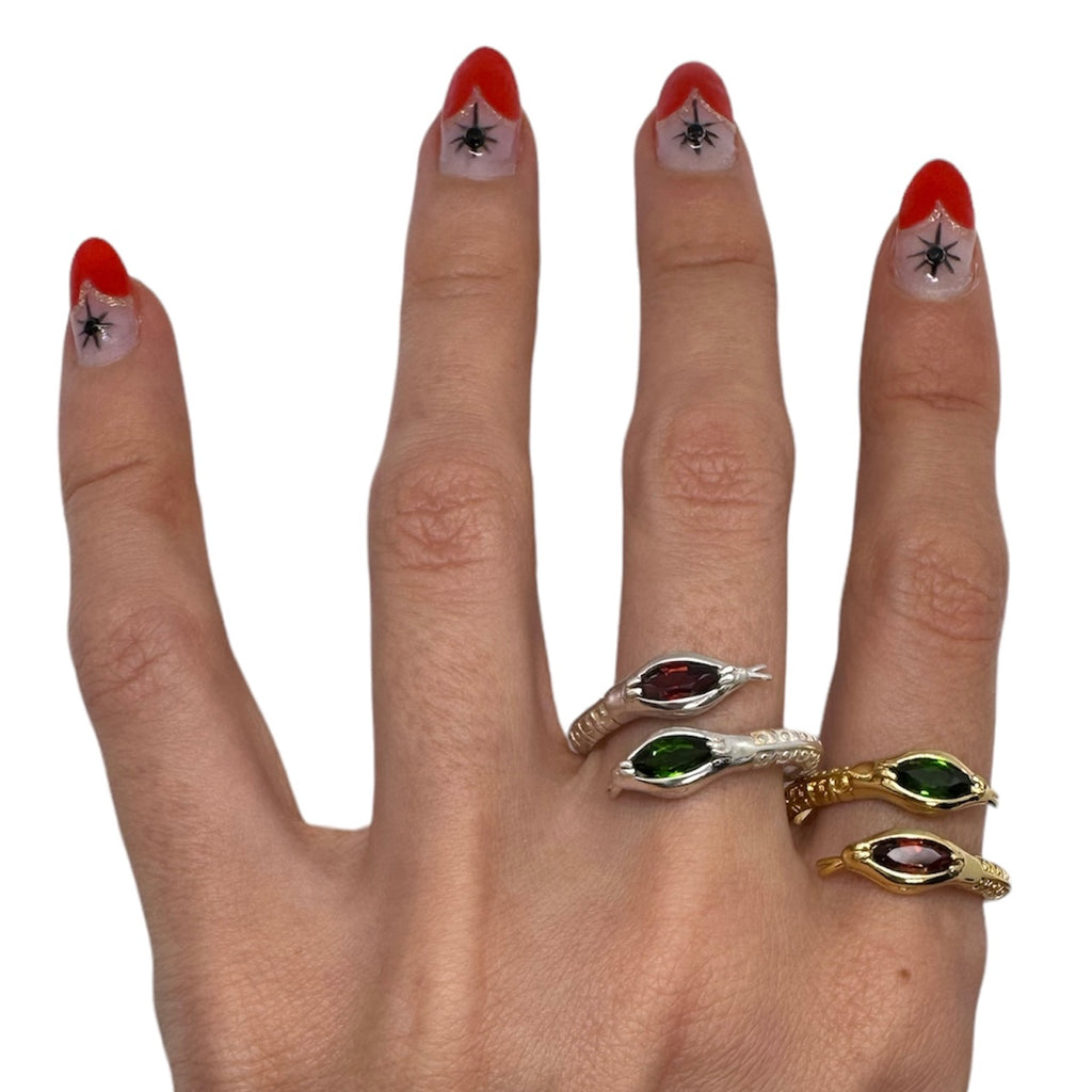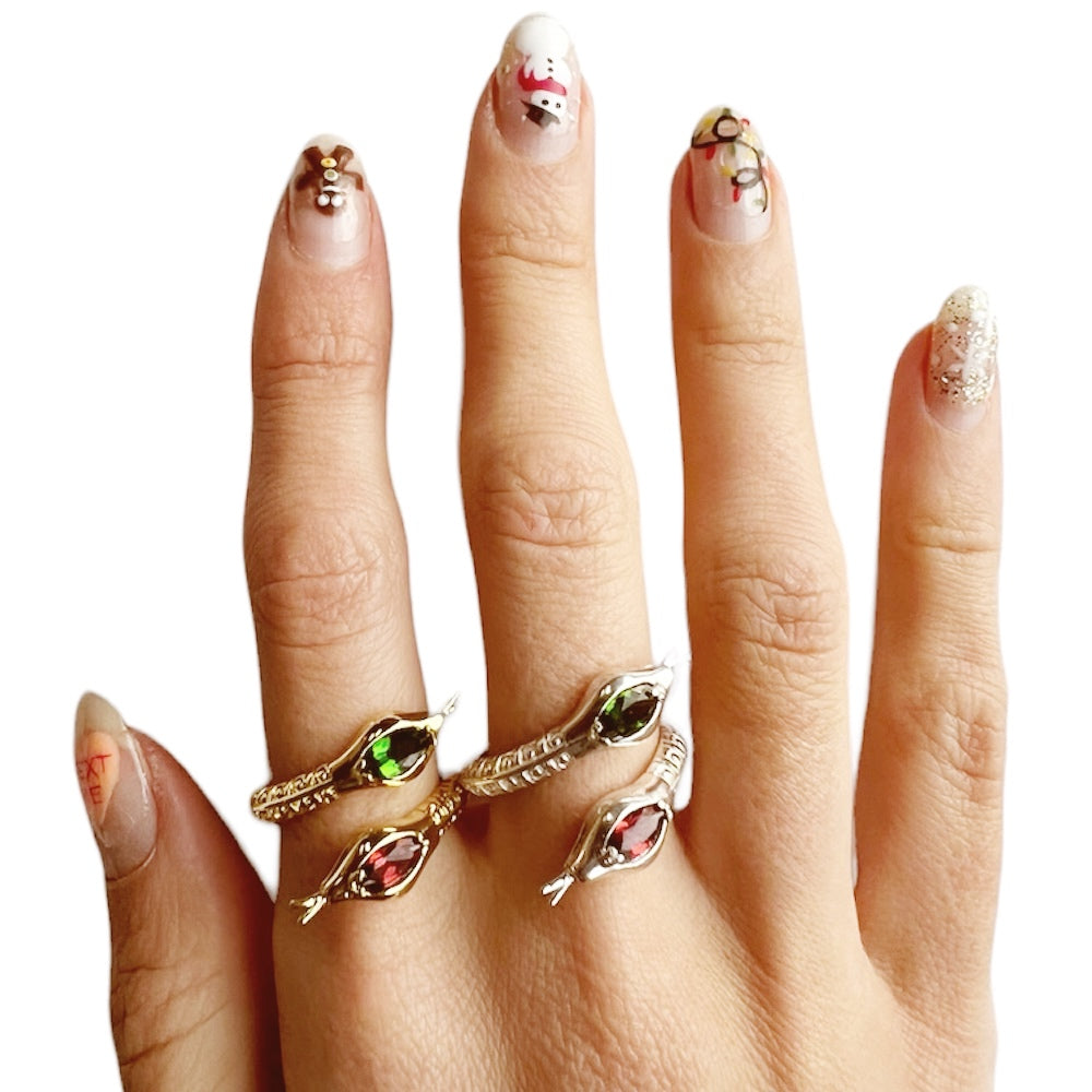 Did you know snakes can smell with their cute tongues? That’s how they know if you’re their person. This ring has a red garnet stone for protection on top of one head and a green diopsidite stone for self empowerment on top of the other baby snake head that has a super cute tongue sticking out!
