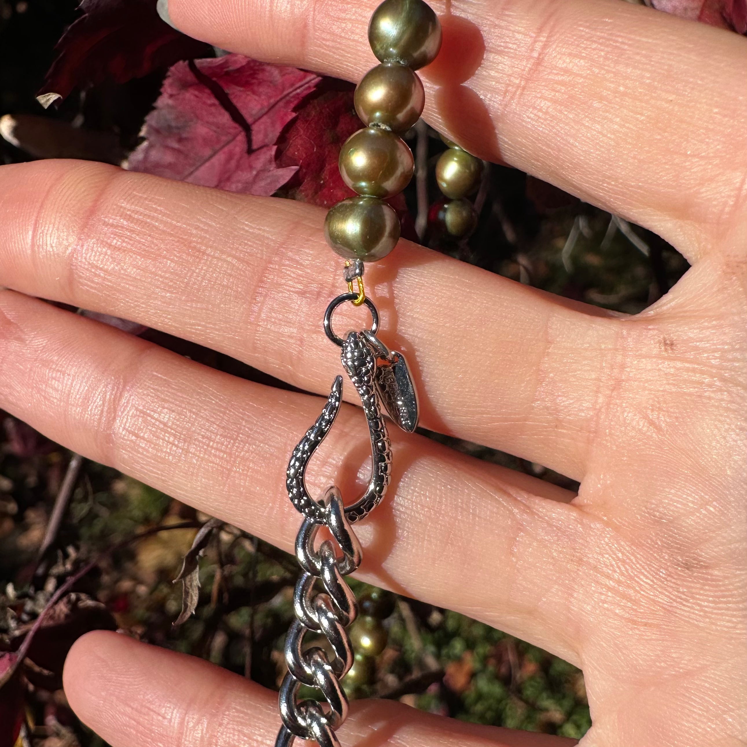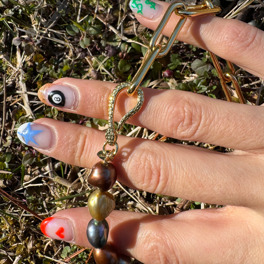 Like women, these pearls are gorgeous real fresh water pearls but they’re imperfect in their shape but that’s what makes them perfect interesting, and unique! And the badass clasp is the cherry on top! This strand comes in two lengths 14” for smaller neck choker lewk and 16” for a slightly roomier option. Men, please buy the 18” or 16” if you’re a x-smaller size.