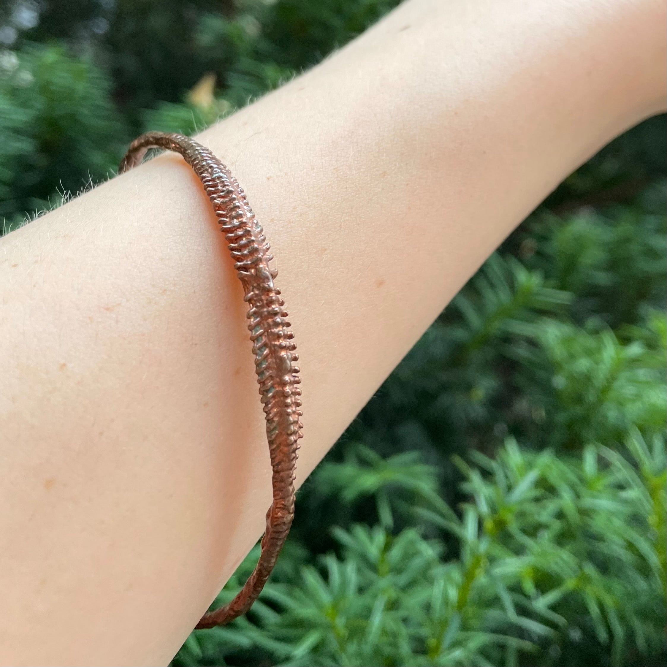 Doubled beautiful spines circle your wrist and in copper which is good for your blood and circulation! Copper bracelets look great alone or stacked up on your wrist! Comes in two different sizes, for tiny wrists small 7.5" and for those who want a bit roomy feel large 9.5"