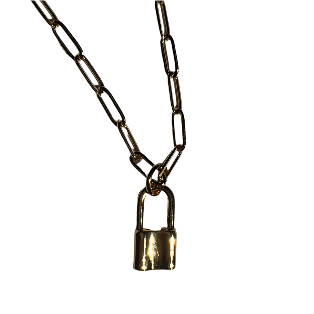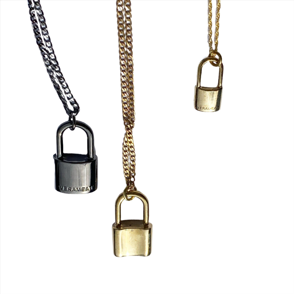 The smaller gold brass lock with silver gold plated chain version of the On Lock necklace is this rad on lock baby that comes with a more delicate rope 16” chain and had a loop at 14” if you want a choker style! Makes a rad family or lover gift too!