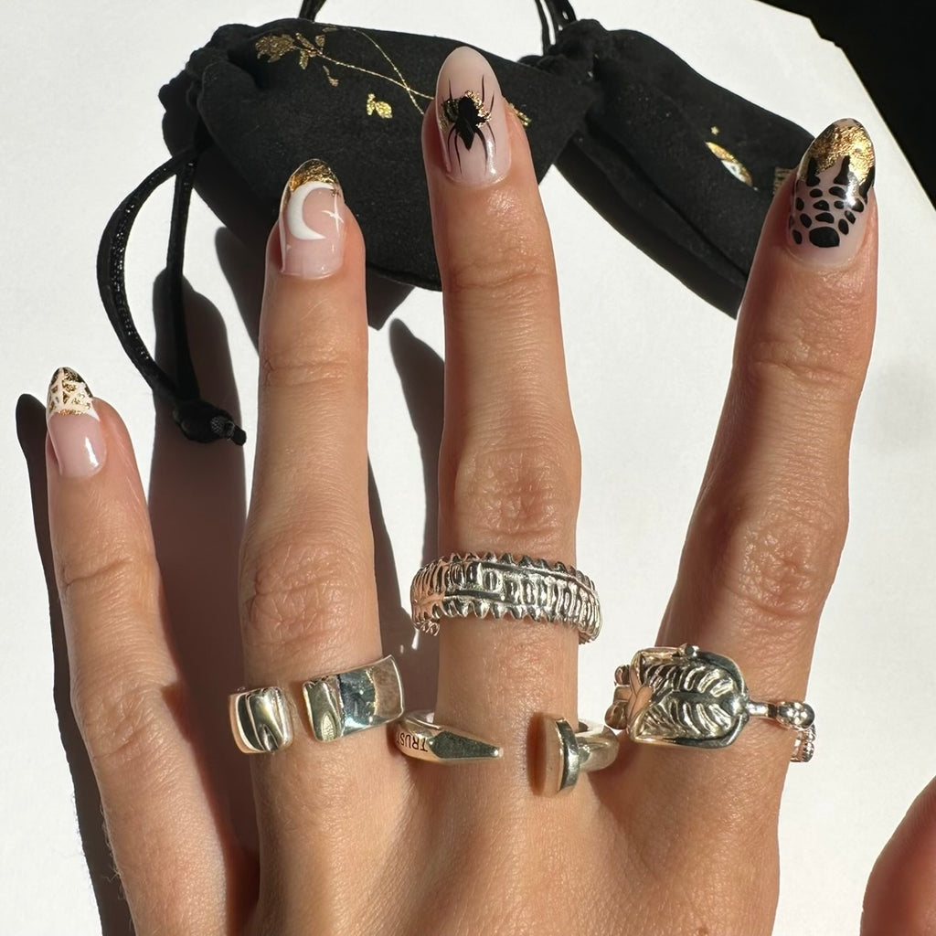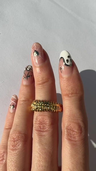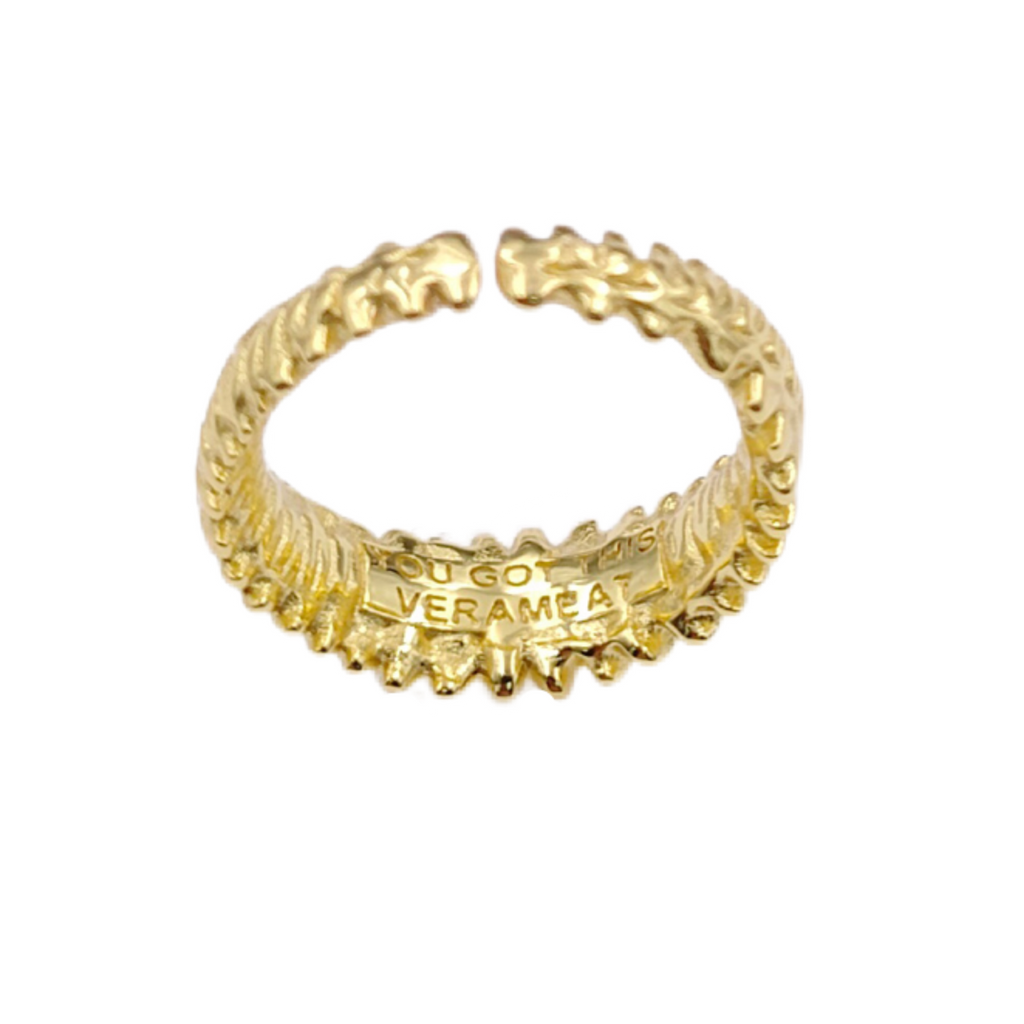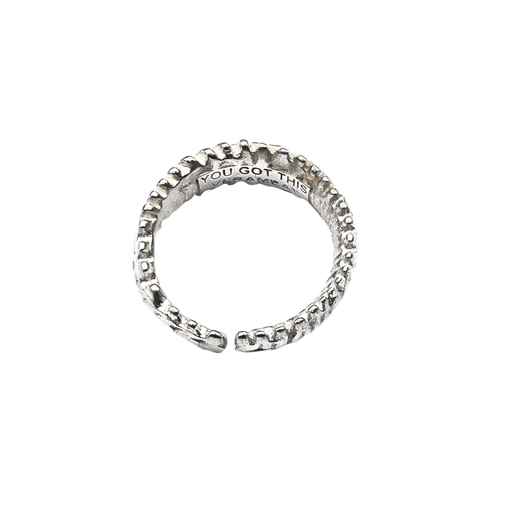 A wearable art spine adjustable ring in celebration of the beauty of nature and human anatomy! Please keep in mind that this ring is adjustable and comfortably fits sizes 4-10. Any smaller or larger sizes with require some extra maneuvering from a jewelry expert. Ring has inspiring inside band, making it a thoughtful gift too! Says: "You Got This!"